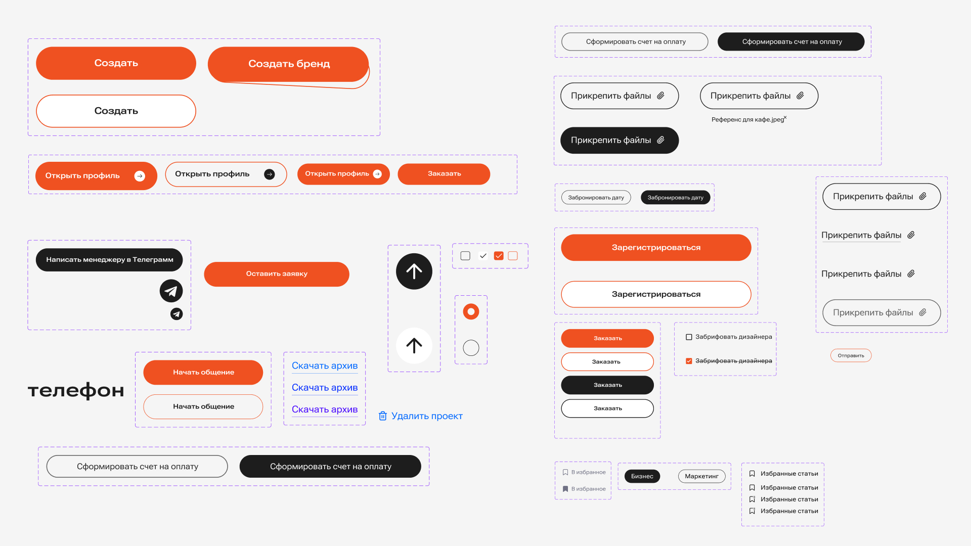 UI-kit – единый перечень визуальных компонентов бренда для цифровой среды (веб-сайтов или приложений). В отличие от гайдбука этот документ включает в себя интерактивные элементы: кнопки и их состояние (активные, неактивные и при наведении), иконки и другие интерфейсные компоненты, которые можно прямо копировать и использовать в новых страницах сайтов или приложений.